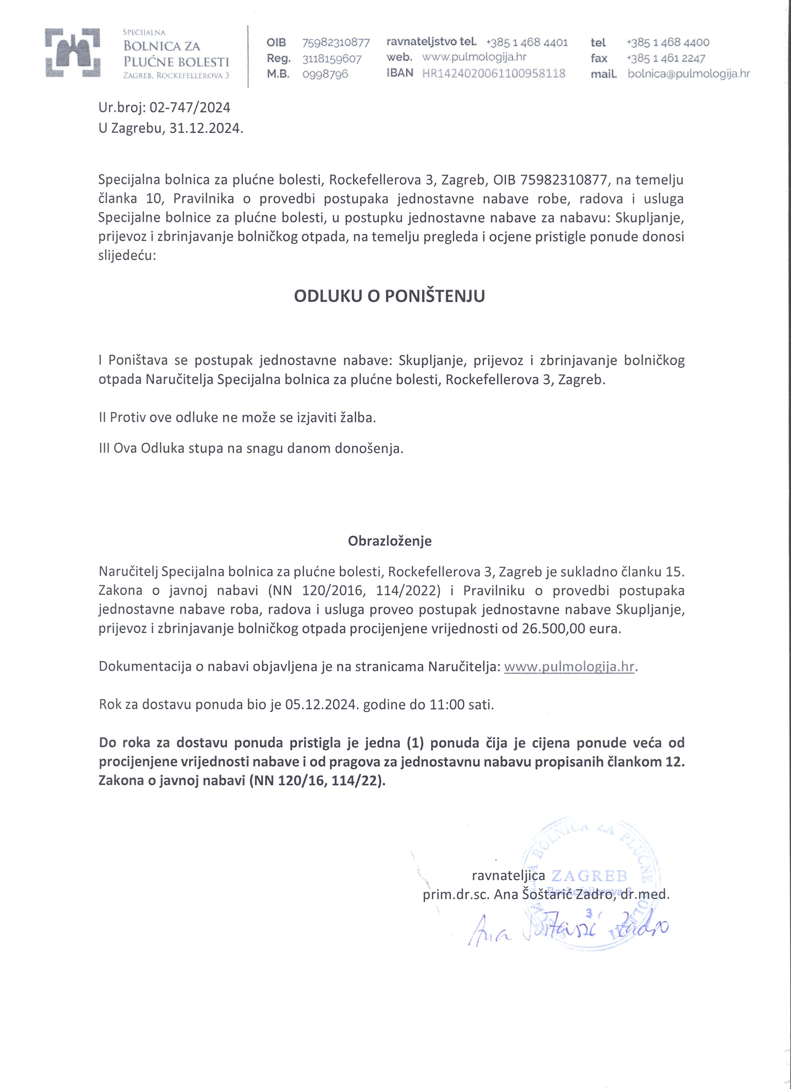 Poziv za dostavu ponude i Troškovnik u predmetnom postupku: Skupljanje, prijevoz i zbrinjavanje bolničkog otpada.