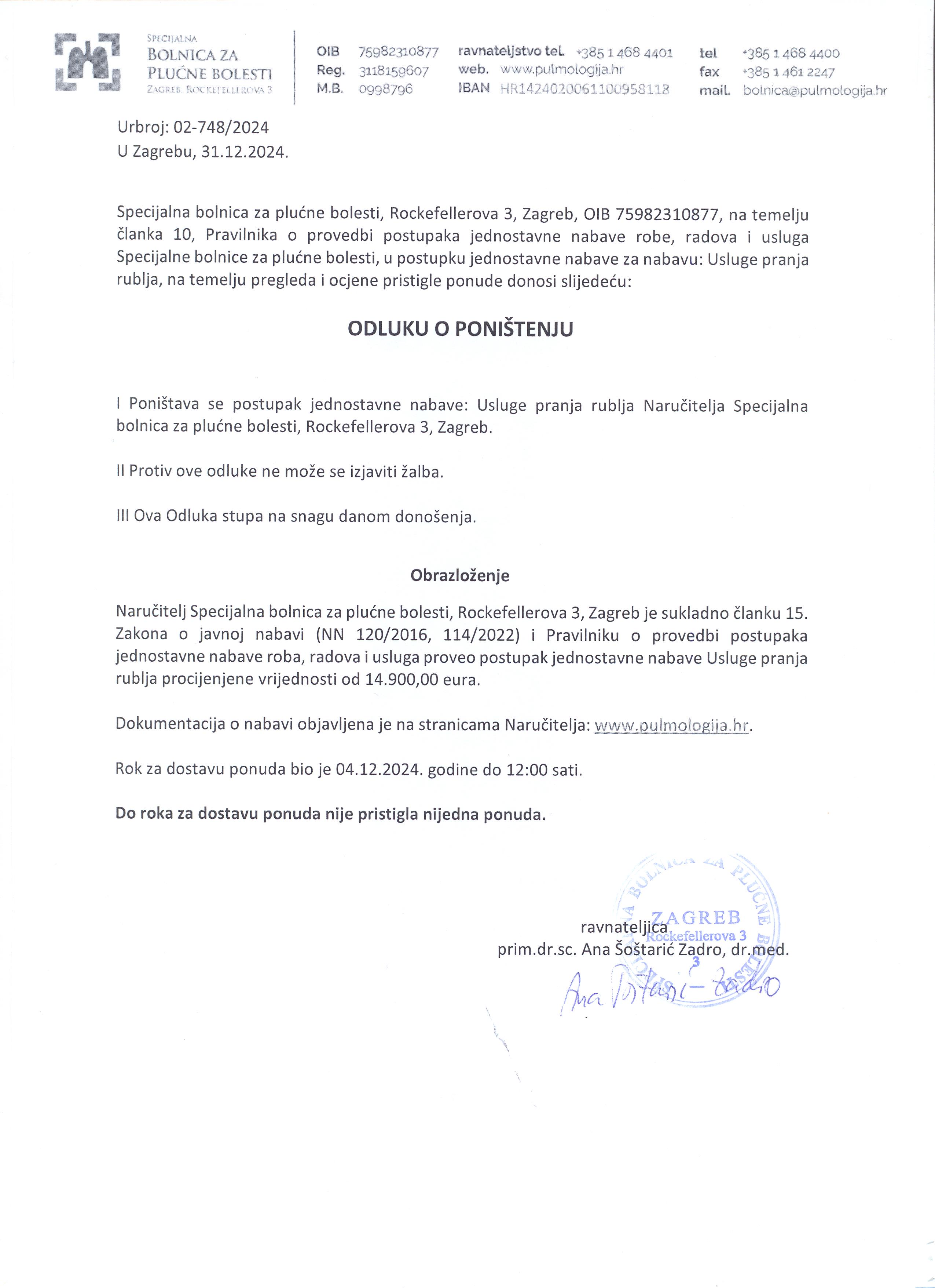 Odluka o poništenju postupka jednostavne nabave – Usluge pranja rublja